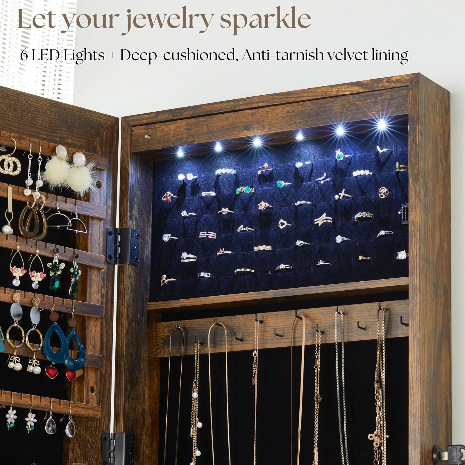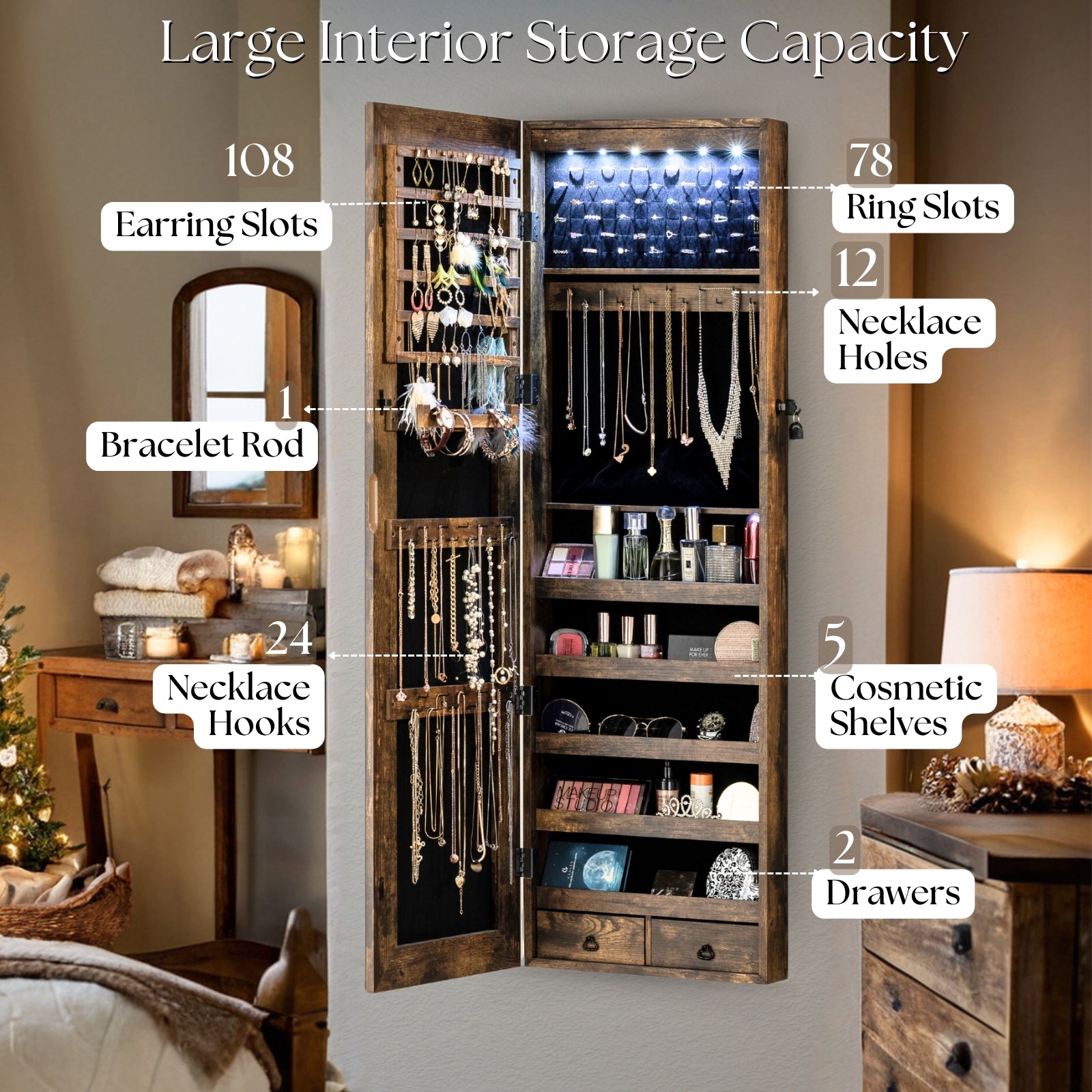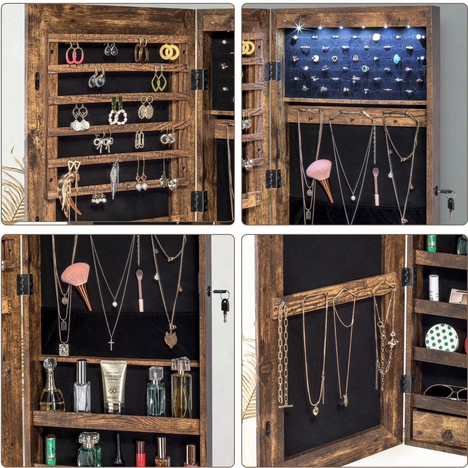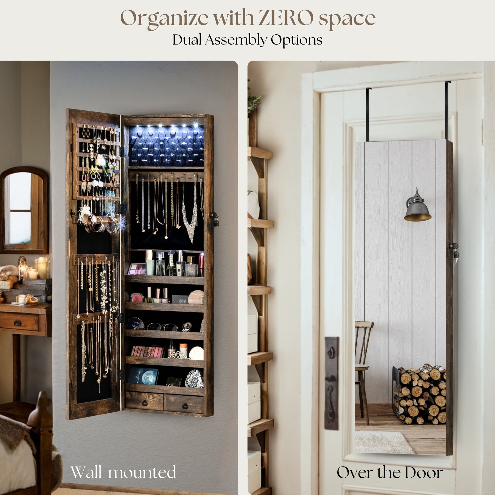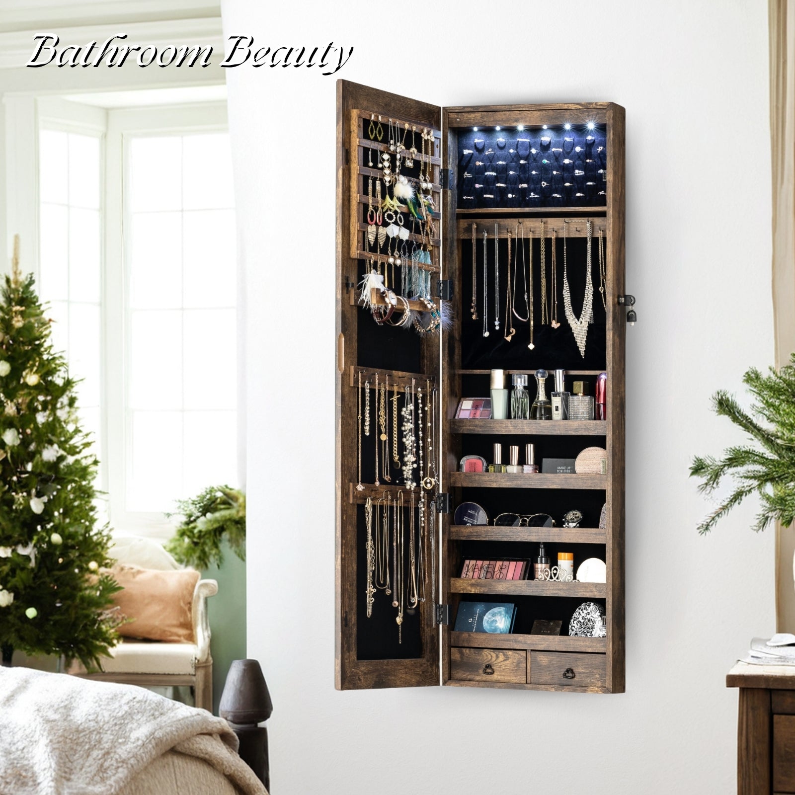 This versatile jewelry cabinet offers ample storage for all your accessories, with a full-length mirror, automatic LED lighting, and a lockable door for added security. Its space-saving design allows for wall-mount or over-the-door installation, making it a practical and stylish solution to organize your necklaces, rings, earrings, and more. Crafted with quality materials and featuring a sleek white finish, this jewelry organizer makes a thoughtful gift for any occasion, from birthdays to anniversaries.